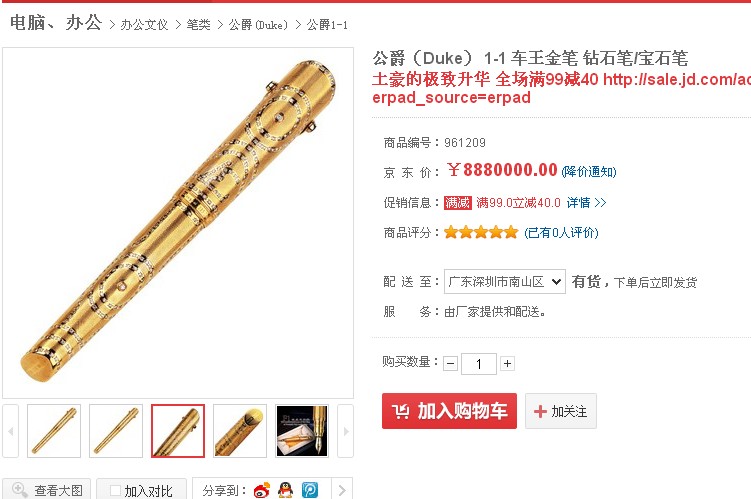 而今日看到京東網(wǎng)爆最貴天價(jià)金筆8880000元的價(jià)格,以18K黃金打造而成,368顆熠熠生輝的天然鉆石群,描繪真F1創(chuàng)造的368公里的速度,4顆天然藍(lán)寶石點(diǎn)綴著來著四方車迷的激情。讓國際大都市伴隨F1賽車,在“上”字賽道上創(chuàng)造時(shí)代的極速。作為新新人類再一次亮瞎了眼。